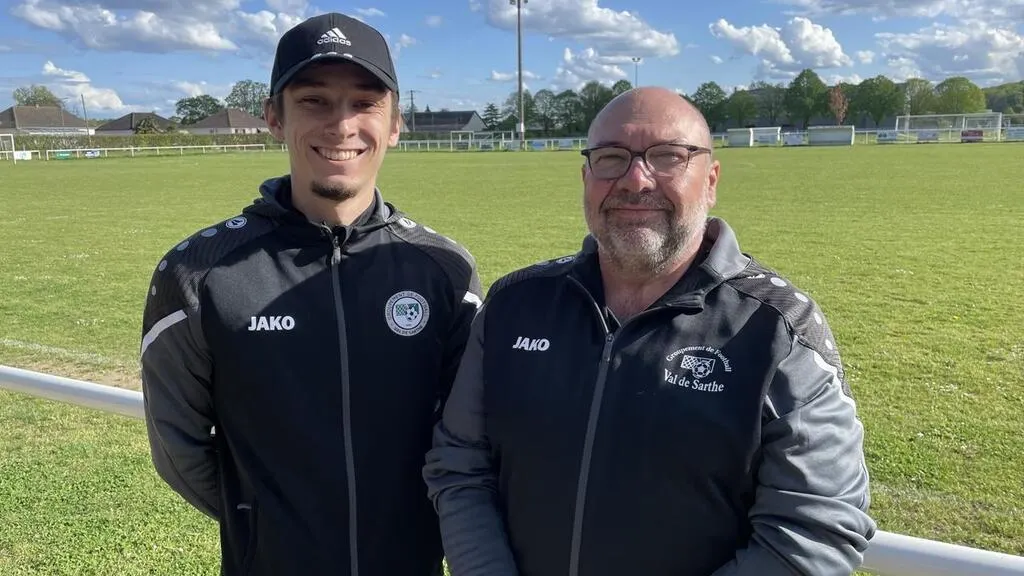 Lenny Rabian, en service civique, et Gilles Miguet, le président du groupement de football Val de Sarthe annoncent une fête, le samedi 26 avril 2025, pour la remise de deux labels. © Le Maine Libre