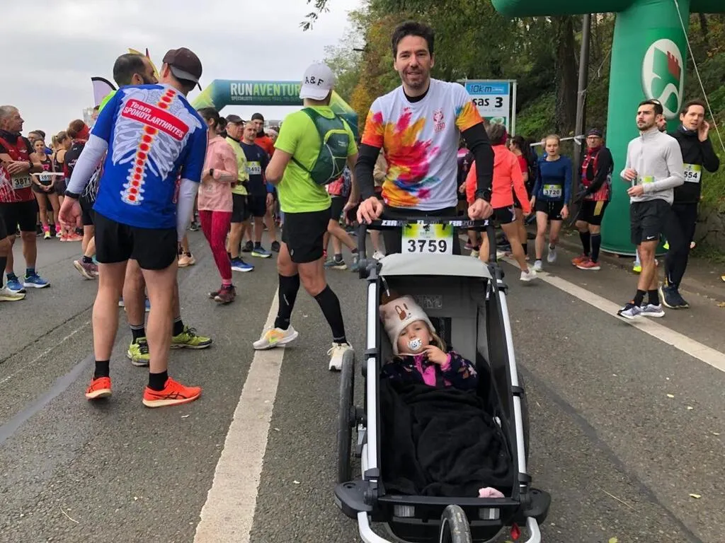 Agathe 3 ans et son papa Mickael, au départ. Photo Le Maine Libre