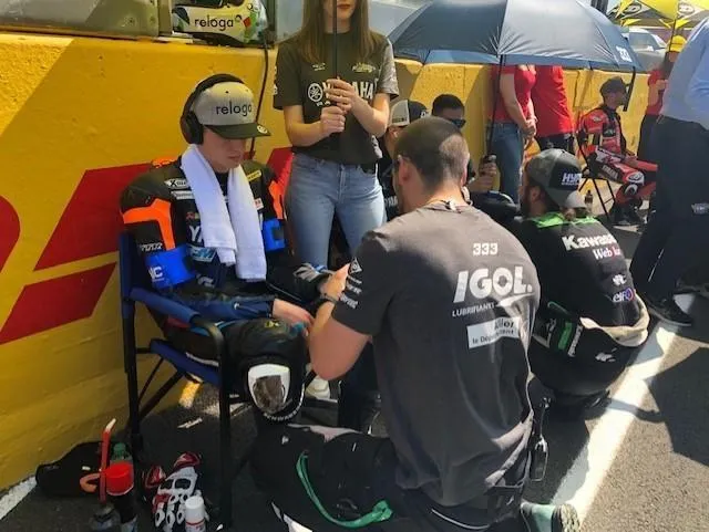 Ultime bain de soleil avant le départ pour les pilotes Kawasaki (N.11). Le Maine Libre