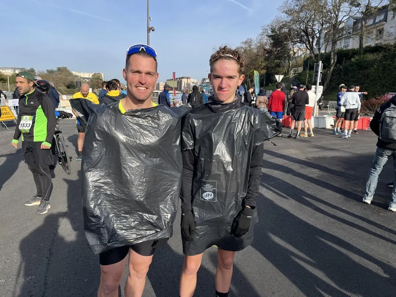 Pour Nicolas et Nolan, pas de vêtements encombrants pour la course. Des sacs poubelles ont servi de coupe vent. Ouest-France