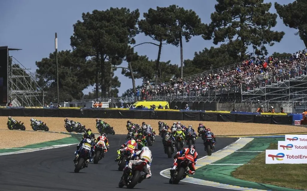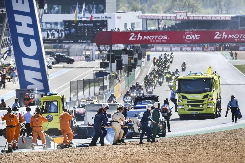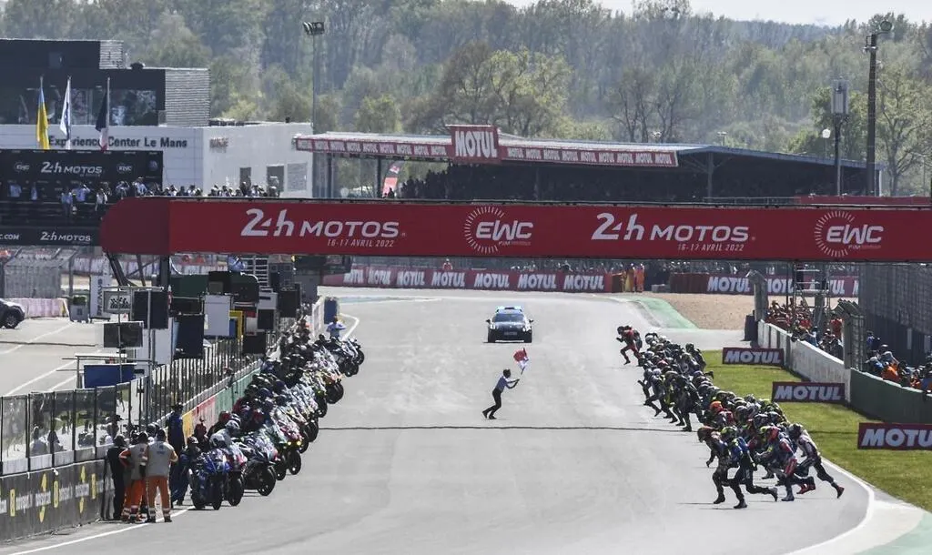 Devant des tribunes remplies d’un public heureux de retrouver l’événement ce samedi 16 avril 2022 après deux éditions marquées par les contraintes sanitaires liées à l’épidémie du Covid-19, les cinquante-deux équipages de la 45e édition des 24 Heures Motos ont pris le traditionnel départ en épi sur la piste du circuit Bugatti. Avant d’être immédiatement ralenti par le safety-car, en raison de deux chutes dès les premiers mètres de la course.