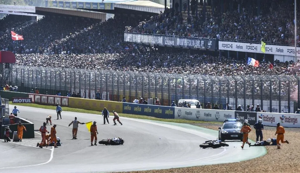 La chute de la numéro 74, pilotée par le doyen de la course Christophe Seigneur et de la Moto Ain numéro 96, pilotée par Bradley SMITH (sorti sur civière et transporté à l’hôpital) ont ralenti le départ de la course ce samedi 16 avril 2022. © Le Maine Libre -Denis LAMBERT