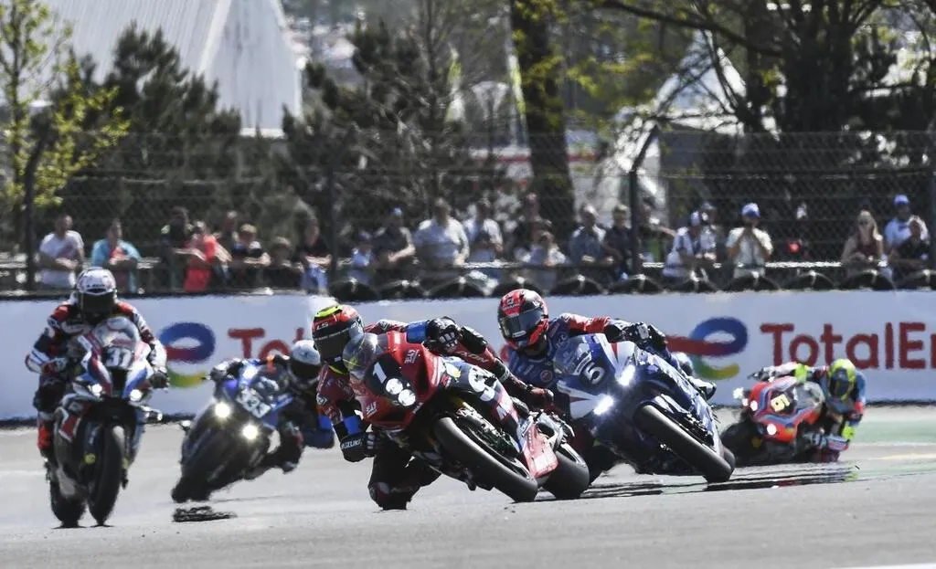 Au bout de la première ligne droite, devant les tribunes remplies, la #74 - Team Seigneur Motosport – pilotée par Christophe Seigneur et la #96 - Team Moto Ain Yamaha – pilotée par Bradley Smith Le Maine Libre – Denis LAMBERT