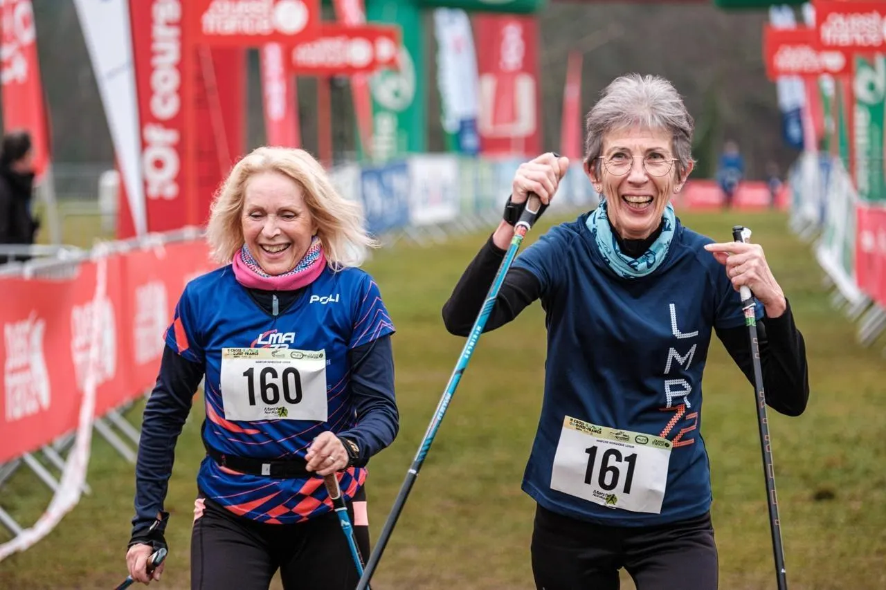 Lors de la marche nordique loisir, Sylvie Menant et Catherine Daboux ont franchi la ligne d’arrivée en 54 minutes et 17 secondes, se classant 3e et 4e. Simon Torlotin / Ouest-France