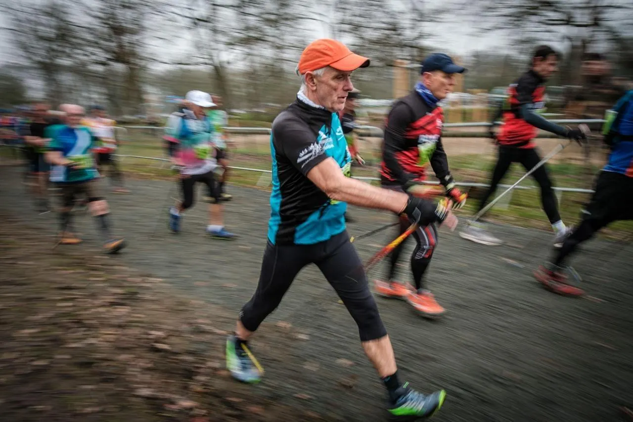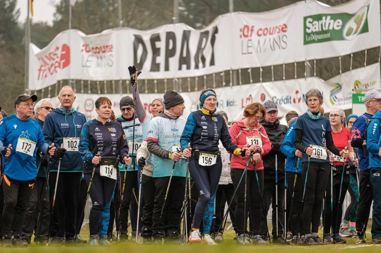 352 marcheurs ont pris le départ de la marche nordique en compétition, chez les hommes, sur les chemins des bois de l’Épau. Simon Torlotin / Ouest-France