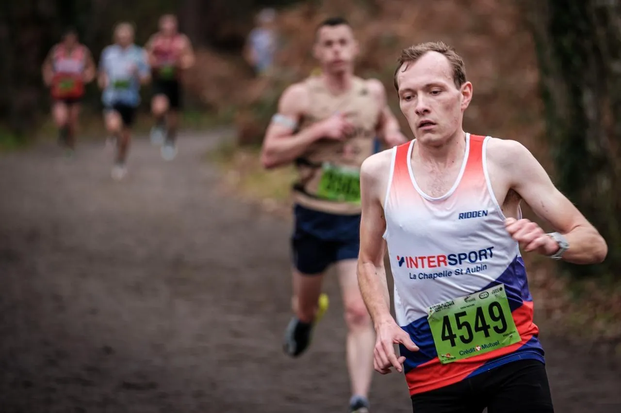 Stéfan Cordier remporte pour la 3e fois le 10 km nature du Cross Ouest France en franchissant la ligne d’arrivée à 34 minutes et 21 secondes. Simon Torlotin / Ouest-France
