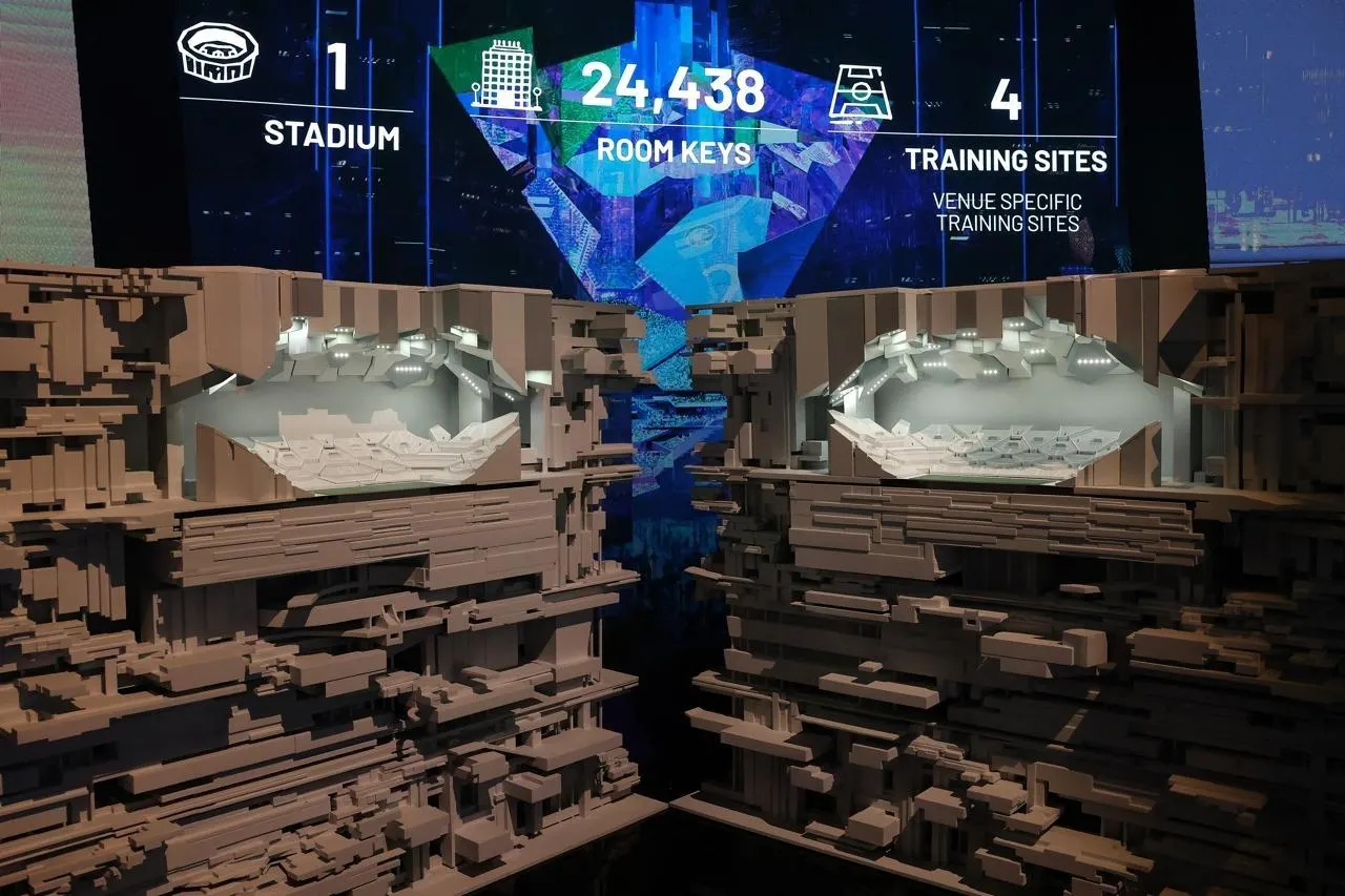 Illustration montrant le stade de Néom, construit dans un immeuble à plus de 300 m de haut. © Fayez Nureldine /AFP
