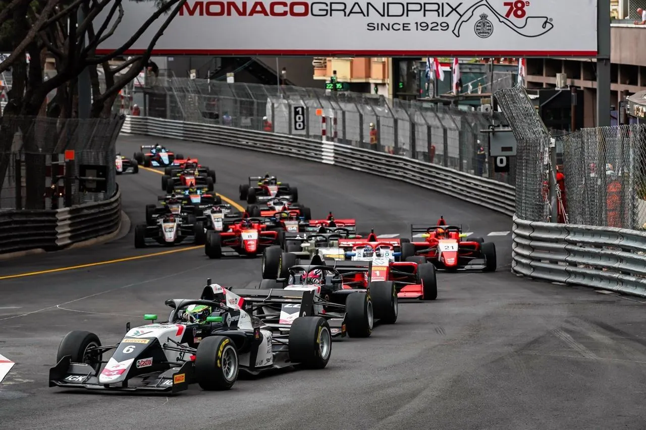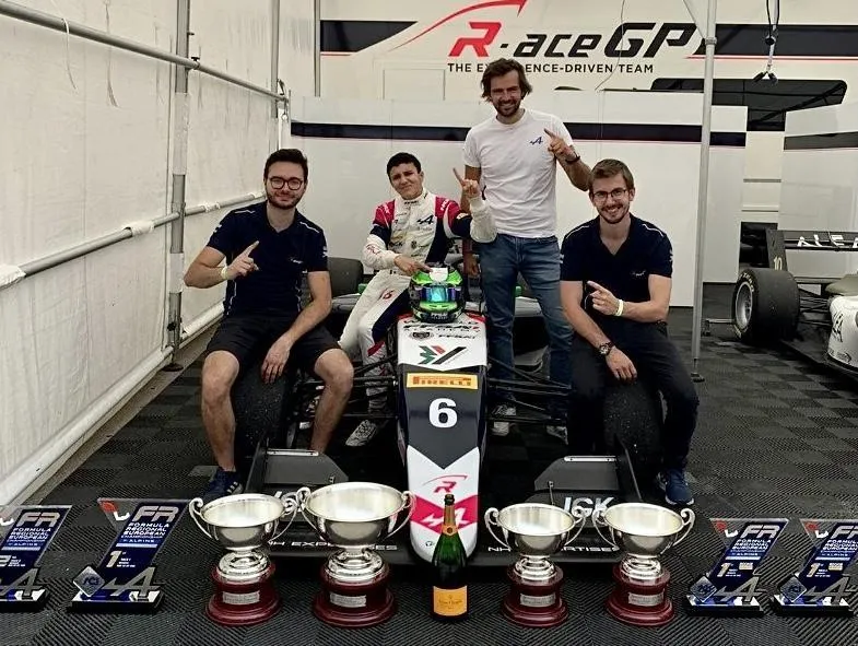 Isack Hadjar et Pierre Sancinéna (troisième en partant de la gauche), juste après la victoire décisive à Monaco en Freca. © Photo fournie par Pierre Sancinéna