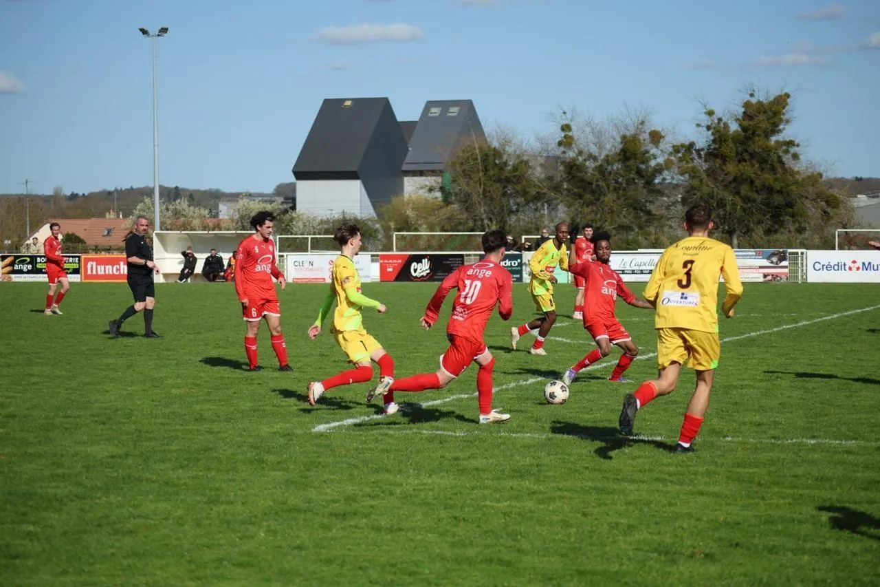 Le Mans Villaret (en jaune), vainqueur de La Chapelle-Saint-Aubin (en rouge) dimanche 15 mars 2026, est la meilleure attaque de la poule E de Régional 3. © Le Maine Libre