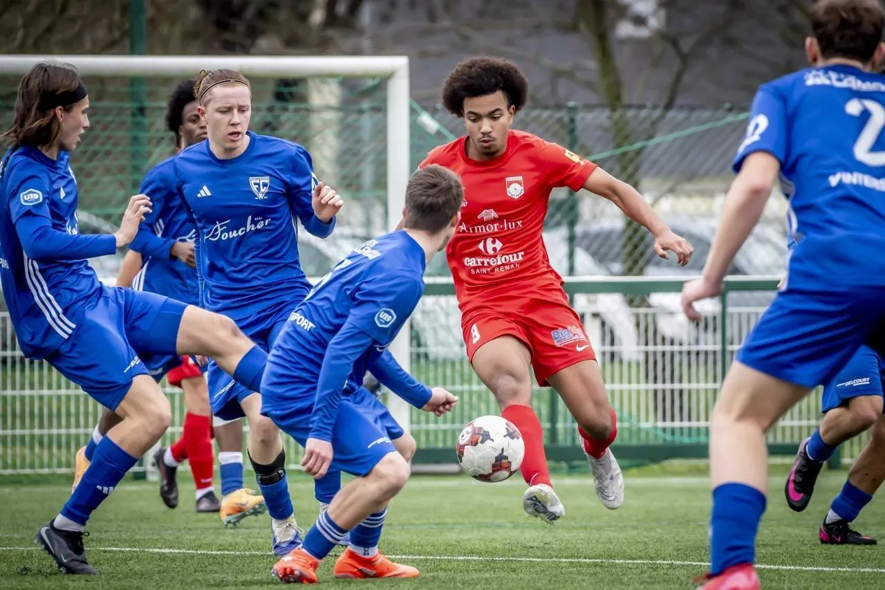 Les U19 de Saint-Lô tentent d’arrêter le Renanais Maxime Ducand. © Franck SEUROT