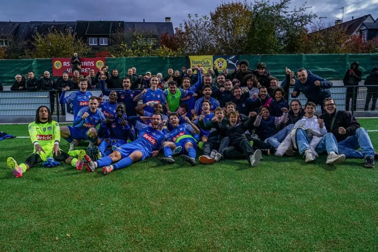 Les joueurs du Sablé FC peuvent exulter en compagnie de leurs supporters, ce samedi soir. Après s’être largement imposés sur la pelouse du Villaret (1-4), ils seront du 7e tour de la Coupe de France. © Arnaud Despelchain