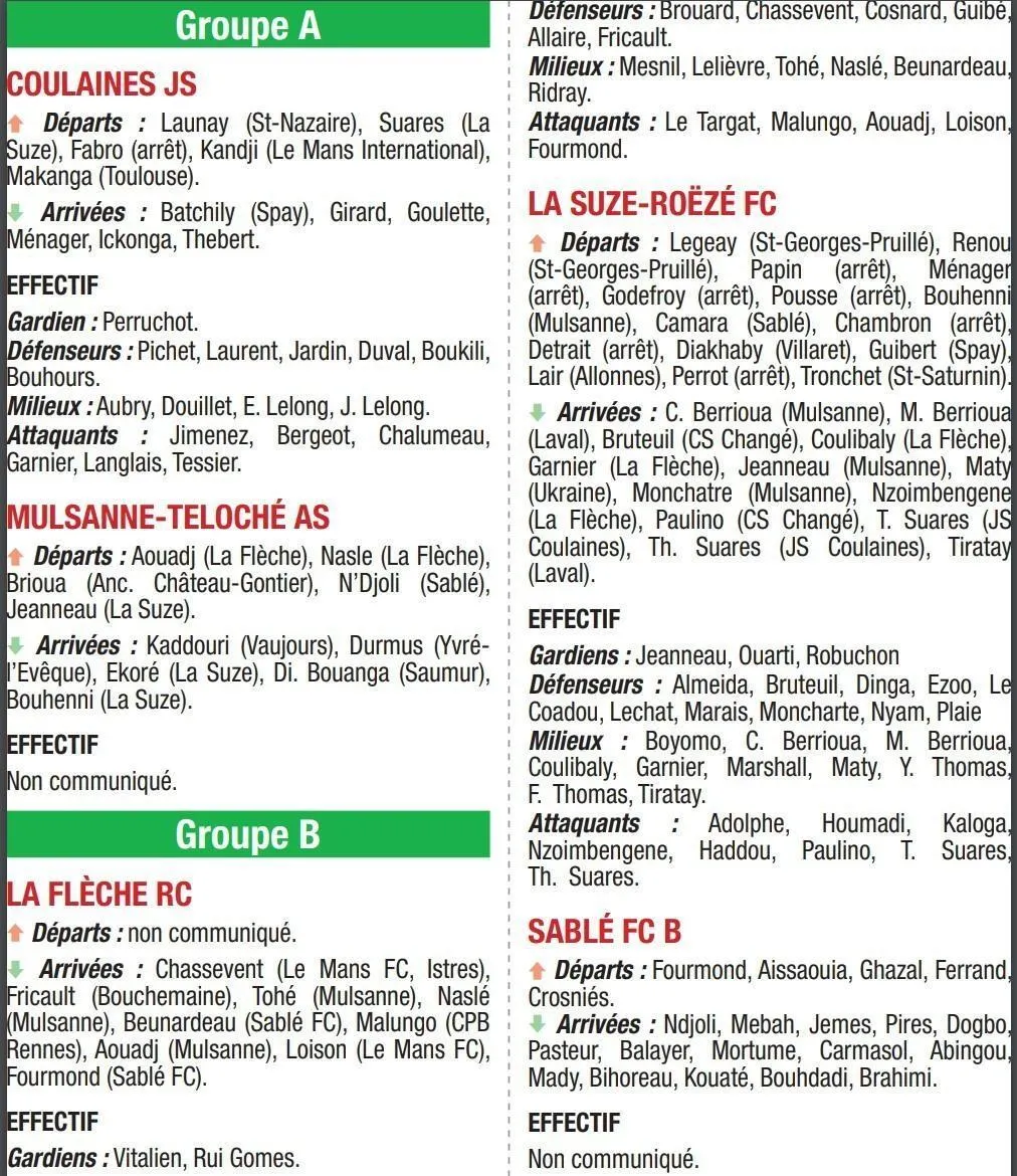 Coulaines et Mulsanne-Teloché seront les deux seuls représentants du département dans cette poule. Du côté des Mulsannais, quelques changements sont à signaler dans l’effectif de Médéric Patry. Les départs des deux attaquants Lounis Aouadj et Marcus N’Djoli seront compensés par les arrivées de Bouhenni et ...