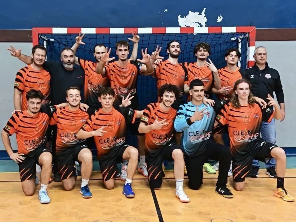 Lucas Hamelin et ses coéquipiers de l’Entente Sarthe Handball Pays du Mans remportent le derby Sarthois de Prénational. © Hugo Trouvé