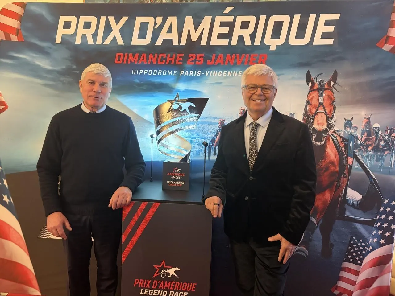 Le trophée du Prix d’Amérique présenté par Jean-Pierre Barjon, président de la Société d’encouragement à l’élevage du trotteur français, au côté de Jean-Pierre Vogel, sénateur de la Sarthe et président du groupe Cheval au Sénat. © Collection personnelle
