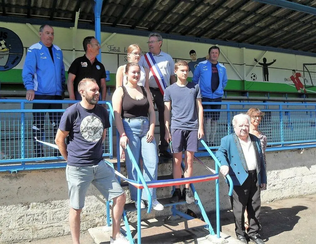En juillet 2022, Roger Percheron, en bas à droite, avait inauguré les travaux de la tribune de football. © Archives Le Maine Libre