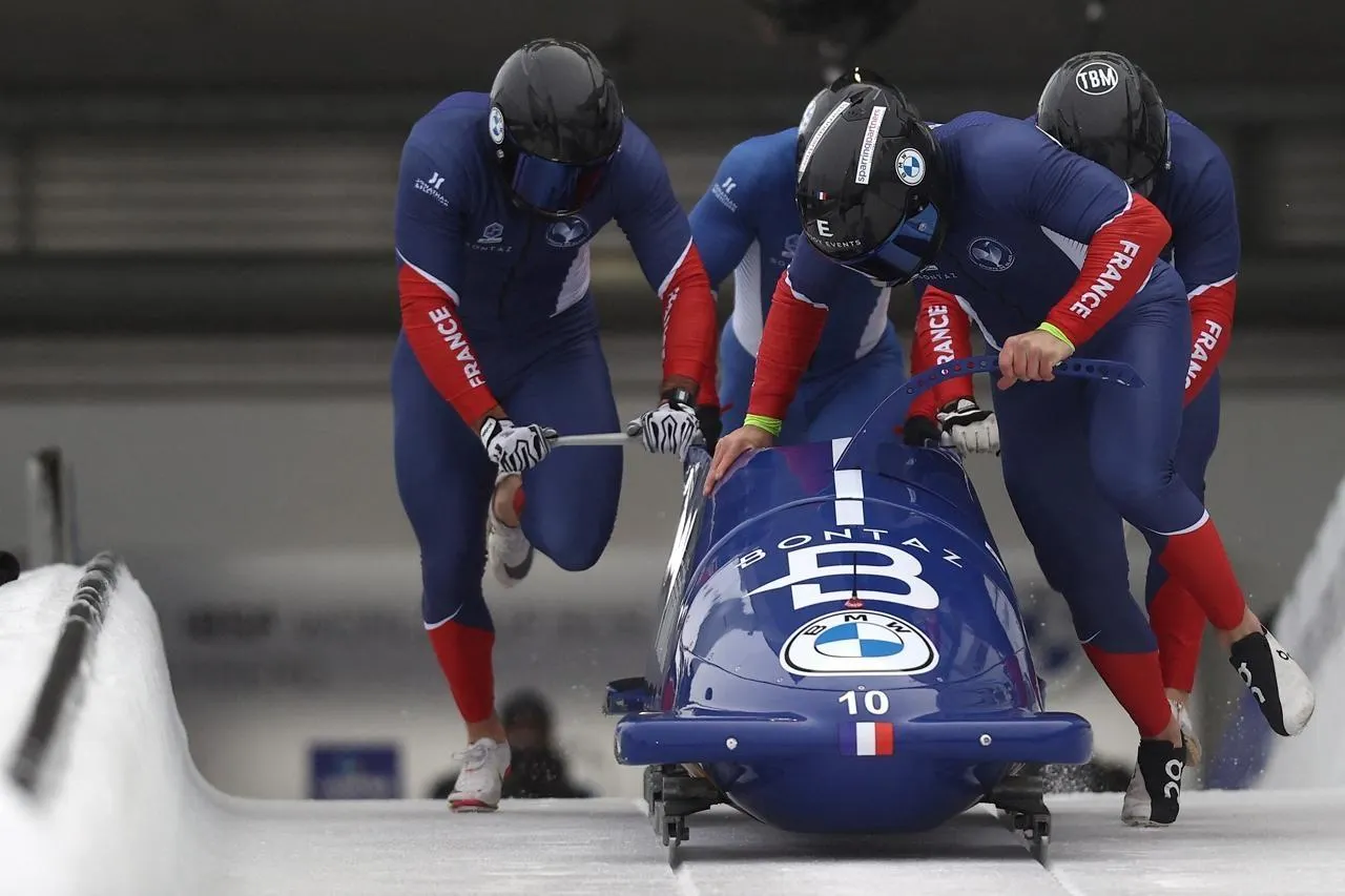 Thomas Delmestre avec Romain Heinrich, Lionel Lefebvre et Jerome Laporal lors de la manche de Coupe du monde de Winterberg, en Allemagne, le 12 décembre 2021. © Getty Images via AFP