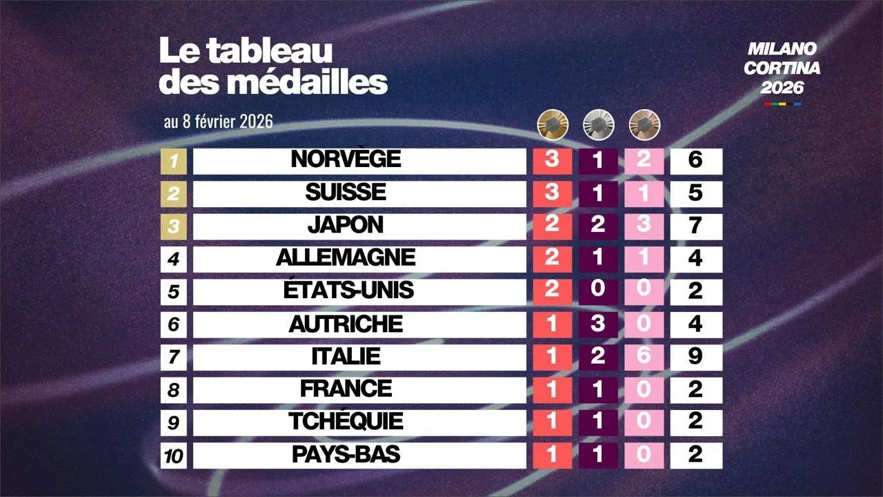 Quelle percée de la Suisse en un seul jour ! Grâce au combiné alpin hommes, la nation helvétique s’est vue propulsée en 2e position du tableau des médailles de ces JO 2026, juste derrière la Norvège. Le Japon, 3e, complète ce podium, notamment grâce à un nouveau titre olympique en snowboard.