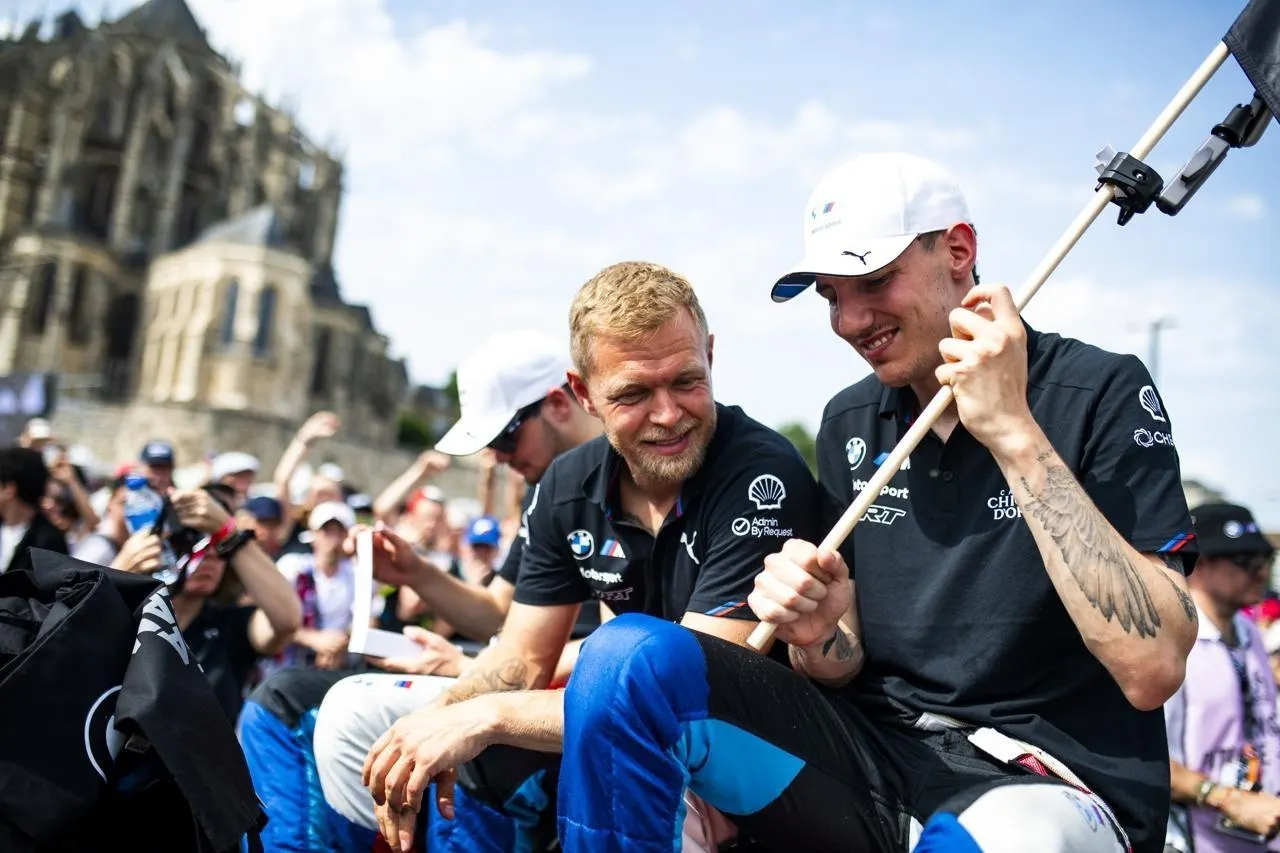 Kevin Magnussen lors de la parade des pilotes des 24 Heures du Mans en juin 2025, dans le centre-ville, alors qu’il était engagé en catégorie Hypercar avec BMW. © DPPI