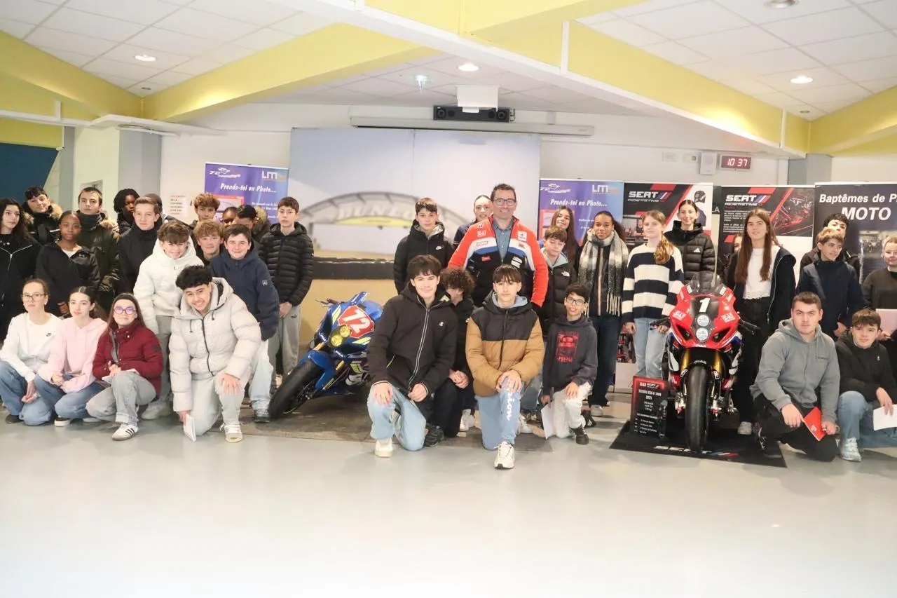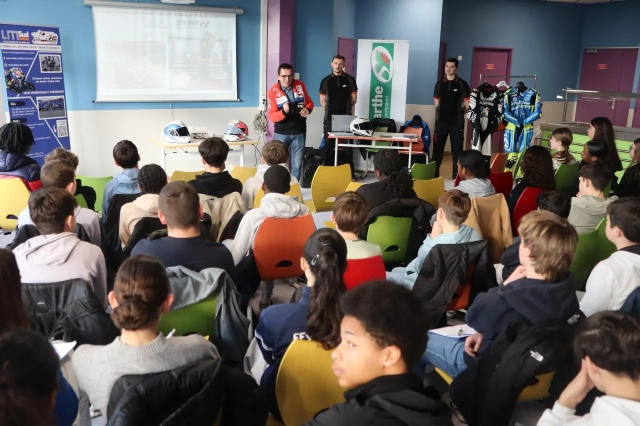 À l’initiative du Conseil départemental de la Sarthe, Damien Saulnier, le patron du Suzuki Endurance Racing Team, et deux élèves du lycée Le Mans Sud, sont venus expliquer leur métier passion aux élèves du collège Pierre-Reverdy de Sablé-sur-Sarthe, mercredi 21 janvier 2026. Une première.