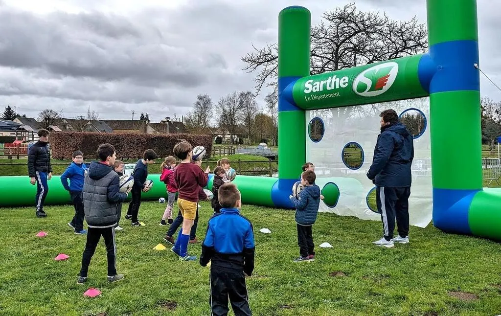 Une animation sur le thème du rugby avec la caravane Sarthe Terre de Jeux lors d’un passage à Beaufay en mars 2023. © CDOS72