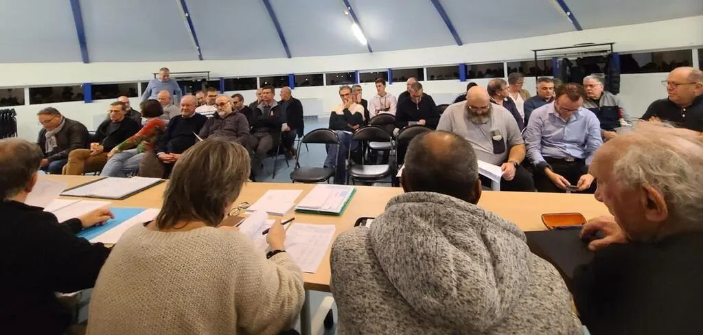 Présidents ou représentants de section du VSF présents à l’assemblée générale face au bureau du VSF central. © Le Maine Libre