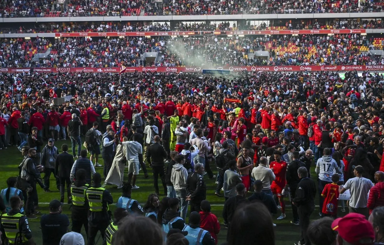 Les supporters du Mans FC envahissent la pelouse du stade Marie-Marvingt à l’issue de la victoire sarthoise contre Versailles synonyme de montée en Ligue 2, le 16 mai 2025. © Archive Le Maine Libre - Denis LAMBERT