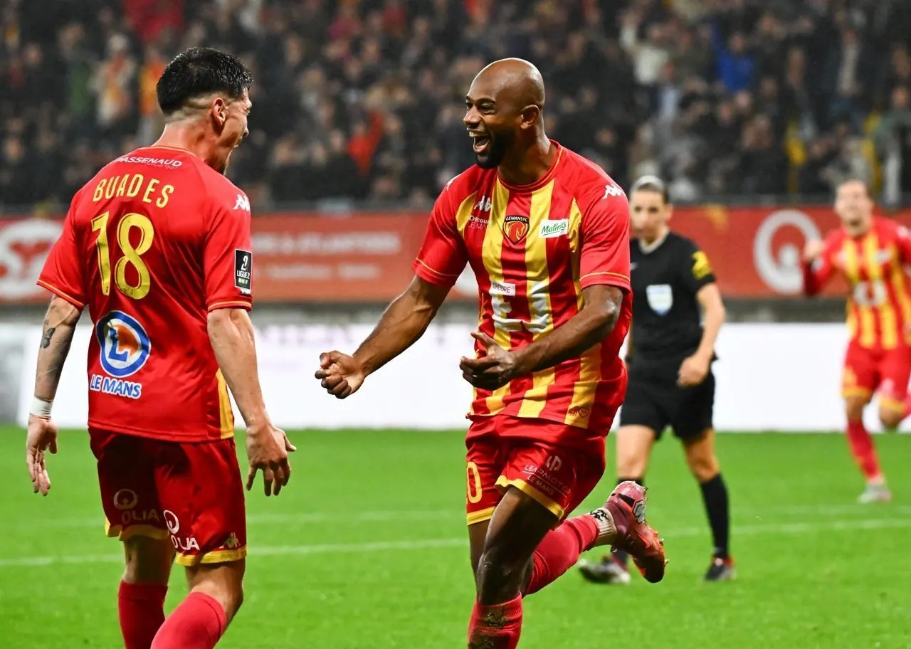 Le Manceau William Harhouz (au centre), buteur face à Troyes, le  3 octobre 2025. © Franck Dubray / Ouest France