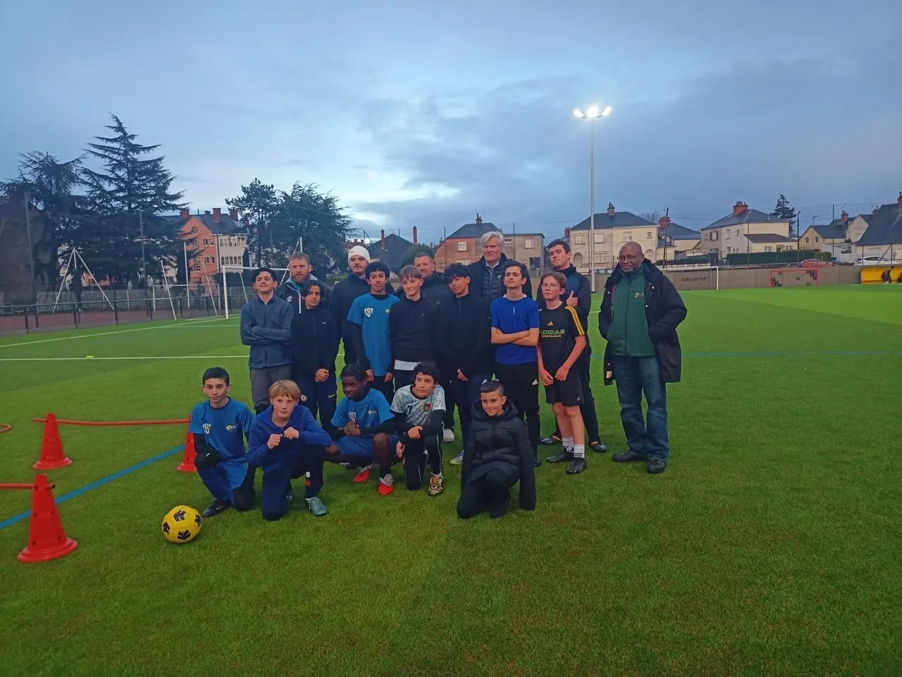 Les joueurs de l’équipe U15 ont interrompu quelques instants leur entraînement sous la pluie pour poser avec Stéphane Le Foll, maire du Mans et Albert Mpondo, président du club. © Le Maine Libre