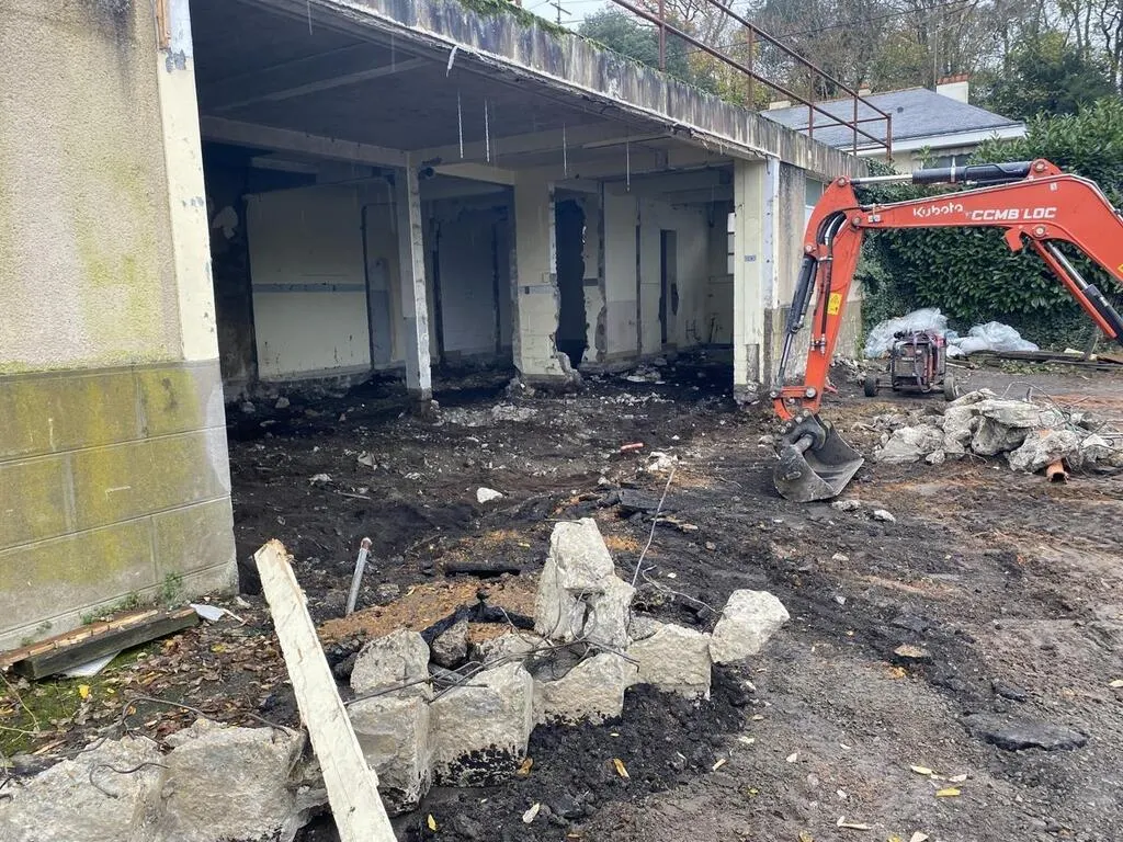 Les travaux de la base de canoë-kayak ont débuté avec la démolition des anciens locaux. Le bâtiment sera lui conservé. © Le Maine Libre