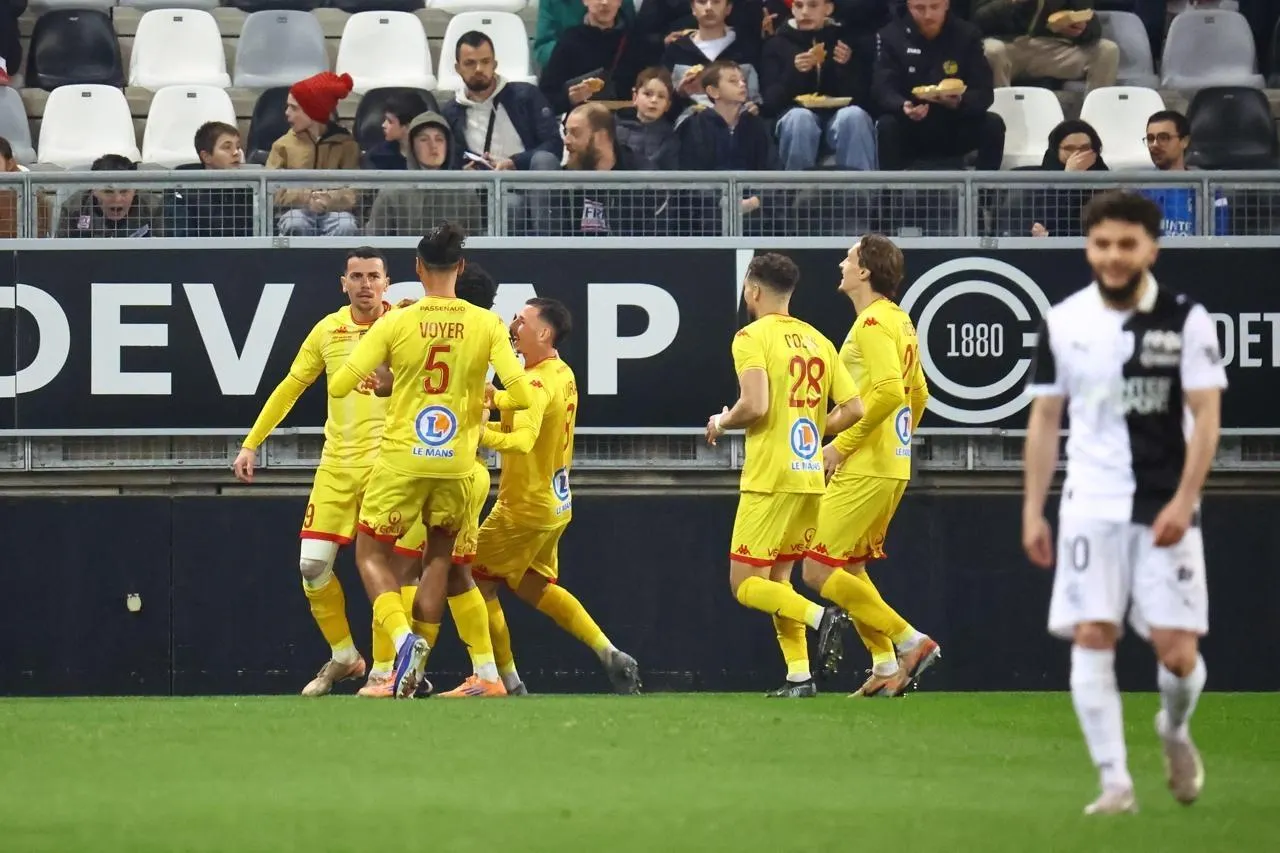 Les Manceaux célèbrent leur premier but, par Antoine Rabillard, face à Amiens, le 20 mars 2026. © PHOTOPQR/LE COURRIER PICARD/MAXPPP