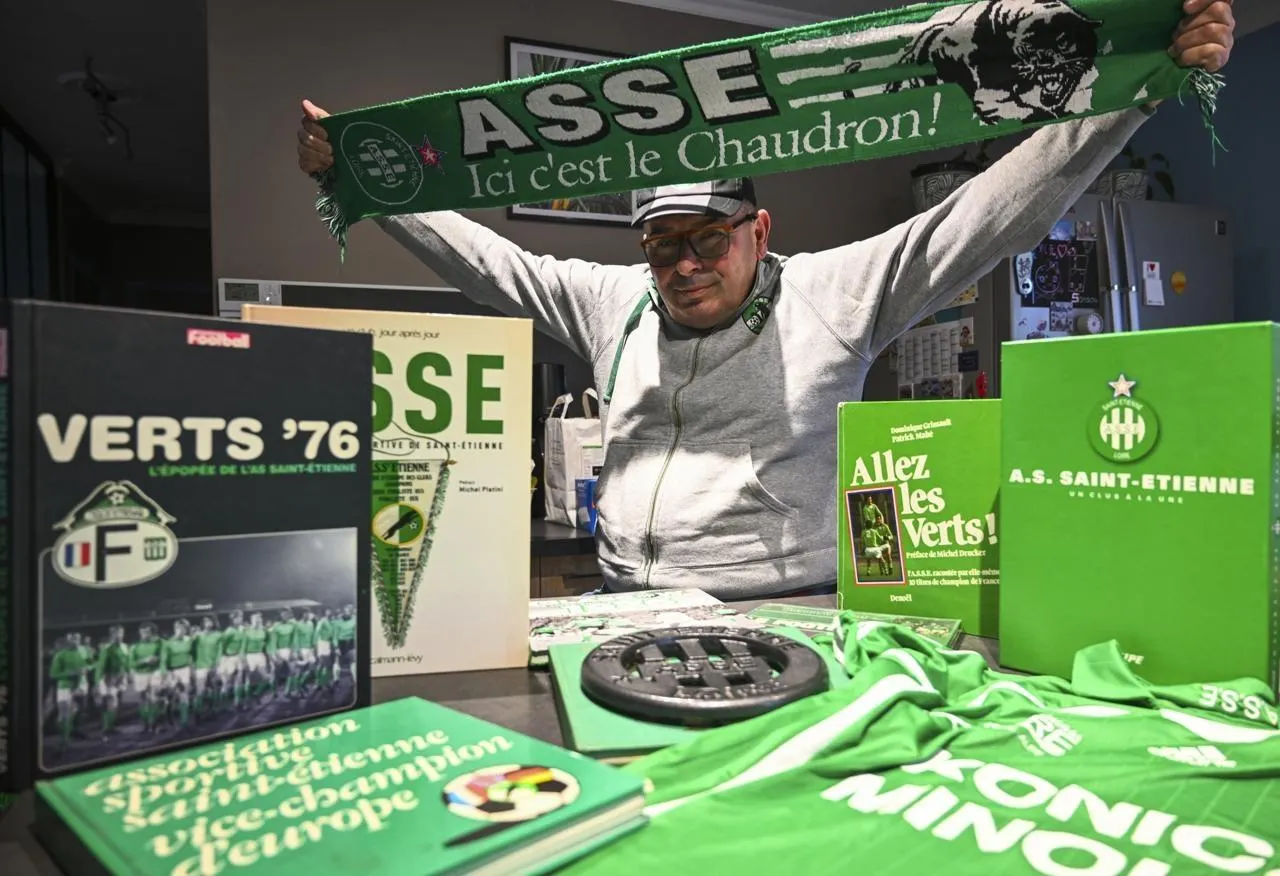 Chez lui, au Mans, l’atmosphère est très stéphanoise. Le plaid sur le canapé, les mugs, les serviettes, et même le dessous-de-plat sont à l’effigie des Verts. Il y a aussi les écharpes et les maillots, les livres, et les magazines.