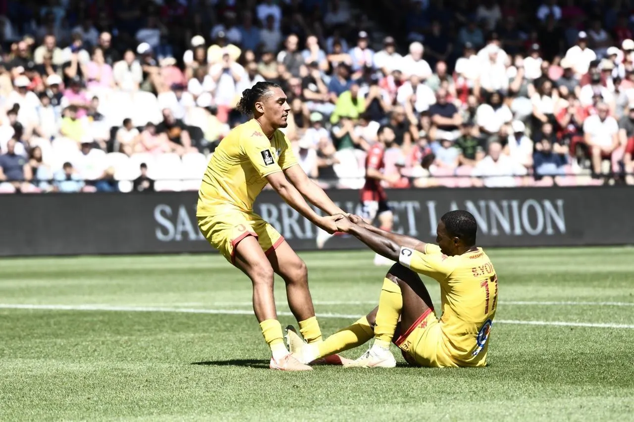 Le Manceau Harold Voyer relève Samuel Yohou sur la pelouse de Roudourou, à Guingamp, le 9 août 2025. © Kévin Guyot / Ouest-France
