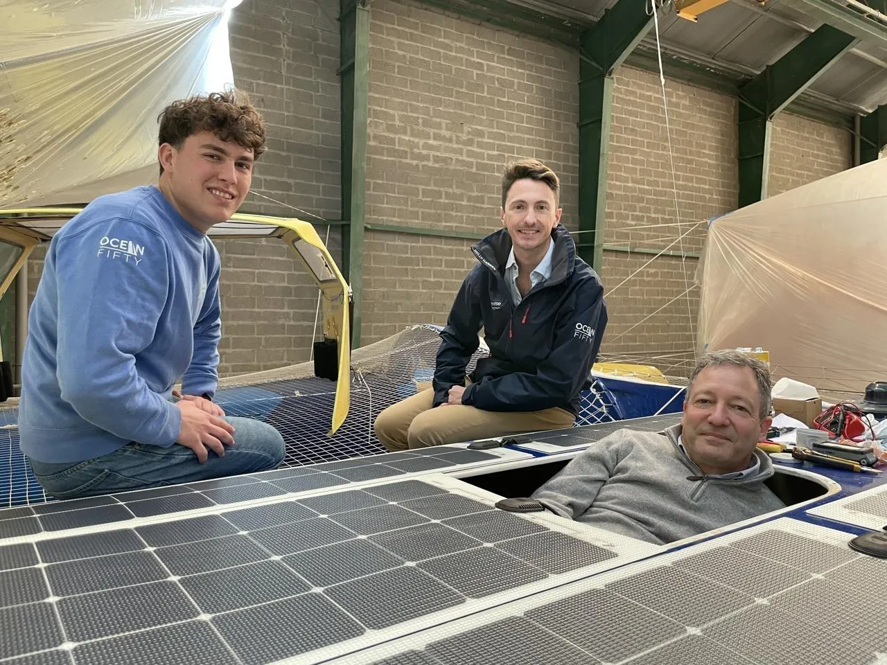 Alan Fourne, Philippe Portal et Franc Raffalli ont travaillé de concert pour équiper le bateau de course Wewise de panneaux photovoltaïques. Une technologie qui va permettre au trimaran d’avoir une énergie plus verte et de réduire son poids pour les courses. © Ouest-France