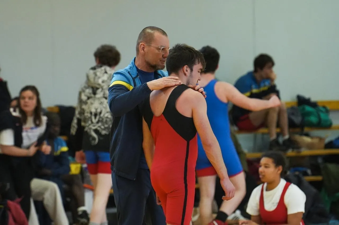 Pierre Gilart de Keranflec’h (SC Orvault Lutte) félicite un lutteur après son combat. © David Chapet