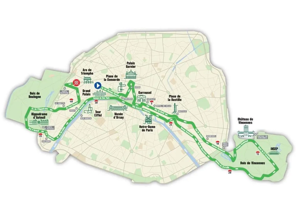 Seule différence par rapport aux précédents tracés : le passage par la place de la Nation, et plus précisément la bifurcation de la rue de Picpus. Les coureurs emprunteront ensuite le parcours habituel avec le Bois de Vincennes, puis passeront sur les berges de la rive droite avant d’atteindre le « mur » des 30 km avec vue sur la tour Eiffel. Les dix derniers kilomètres se feront à travers le Bois de Boulogne avant la délivrance et l’arrivée avenue Foch.