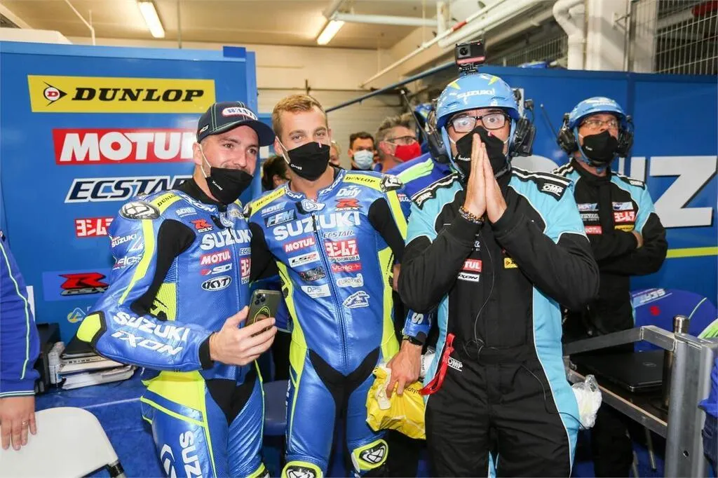 Damien Saulnier (à droite) et les pilotes (Xavier Simeon et Gregg Black), à quelques secondes d’un nouveau titre mondial pour le SERT. © Suzuki Racing
