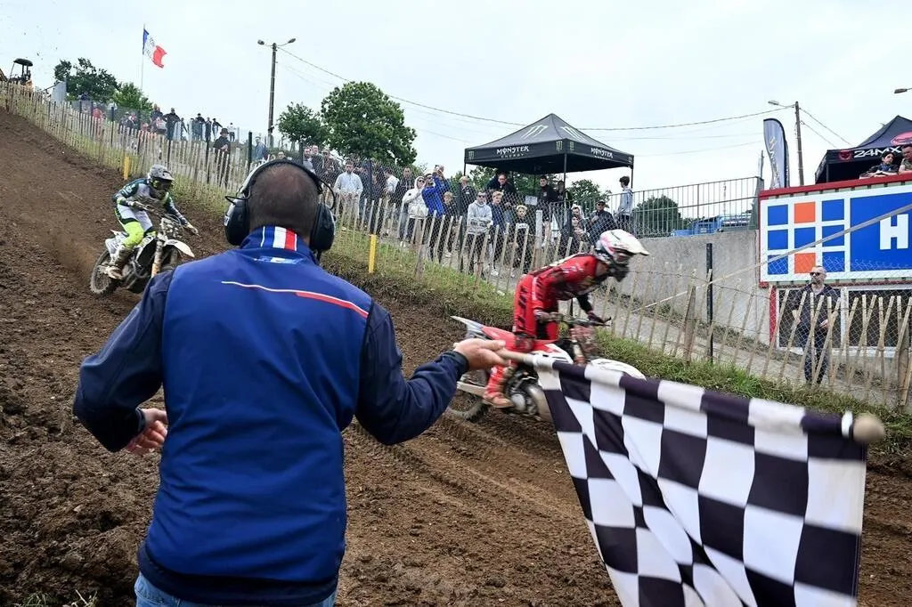 Le drapeau à damiers annonce l’arrivée d’une manche, comme ici en juin 2022 lors du Grand Prix de France de motocross sur le circuit Raymond-Demy, à Ernée (Mayenne). © Archives Marc Ollivier/Ouest-France