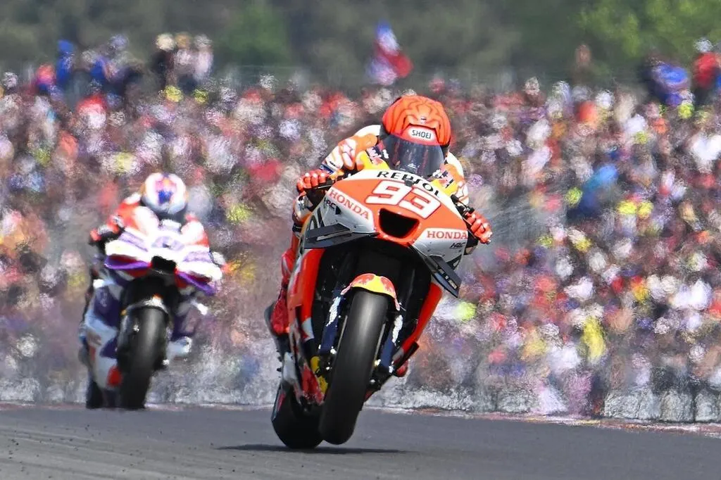L’an dernier, pour le 1 000e GP moto de l’histoire, les pilotes avaient fait le spectacle. Marc Marquez, avec sa Honda numéro 93, avait pris la quatorzième place sur le circuit Bugatti du Mans (Sarthe). © Vincent MICHEL / Archives Ouest-France