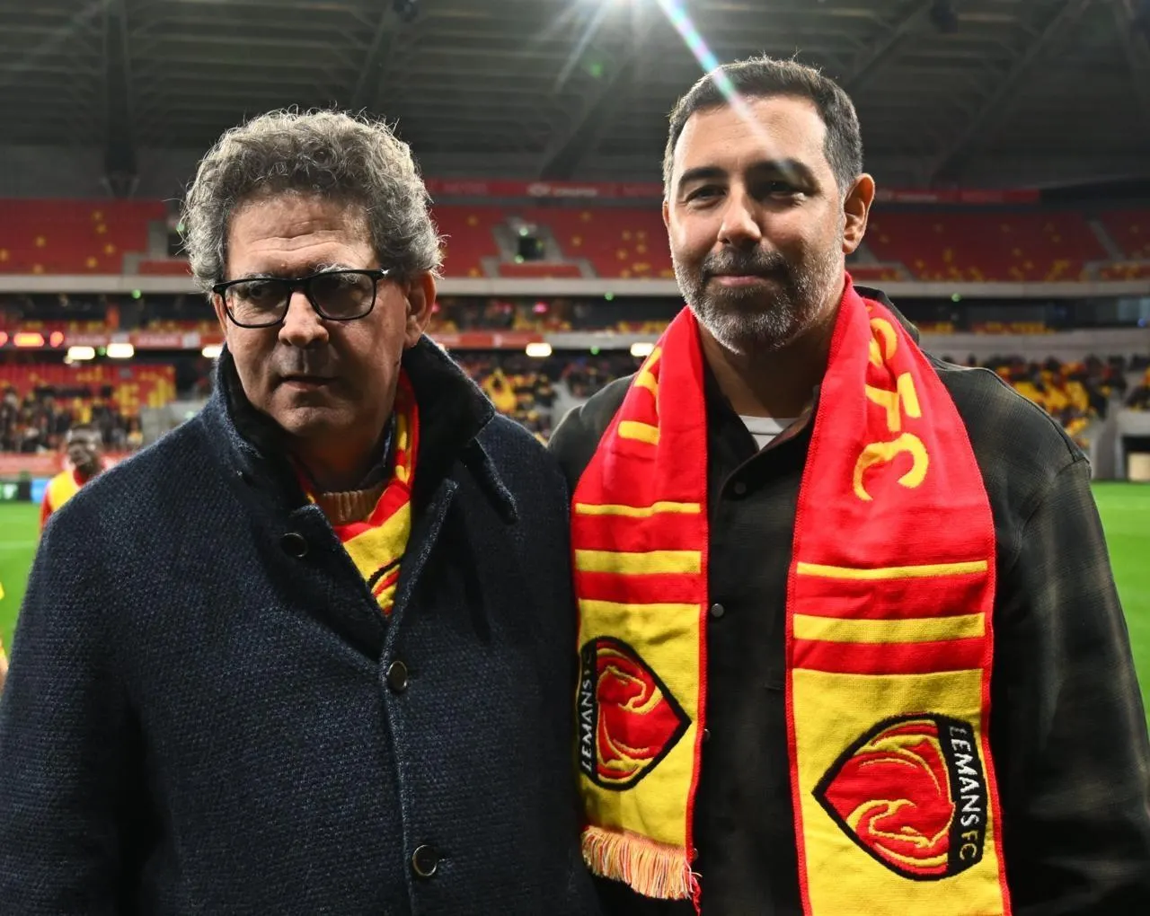 Le président-directeur général du Mans FC, Thierry Gomez (à gauche), accompagné du cofondateur d’OutField et nouveau président du conseil d’administration du club sarthois, Pedro Oliveira. © Le Maine Libre - Denis Lambert