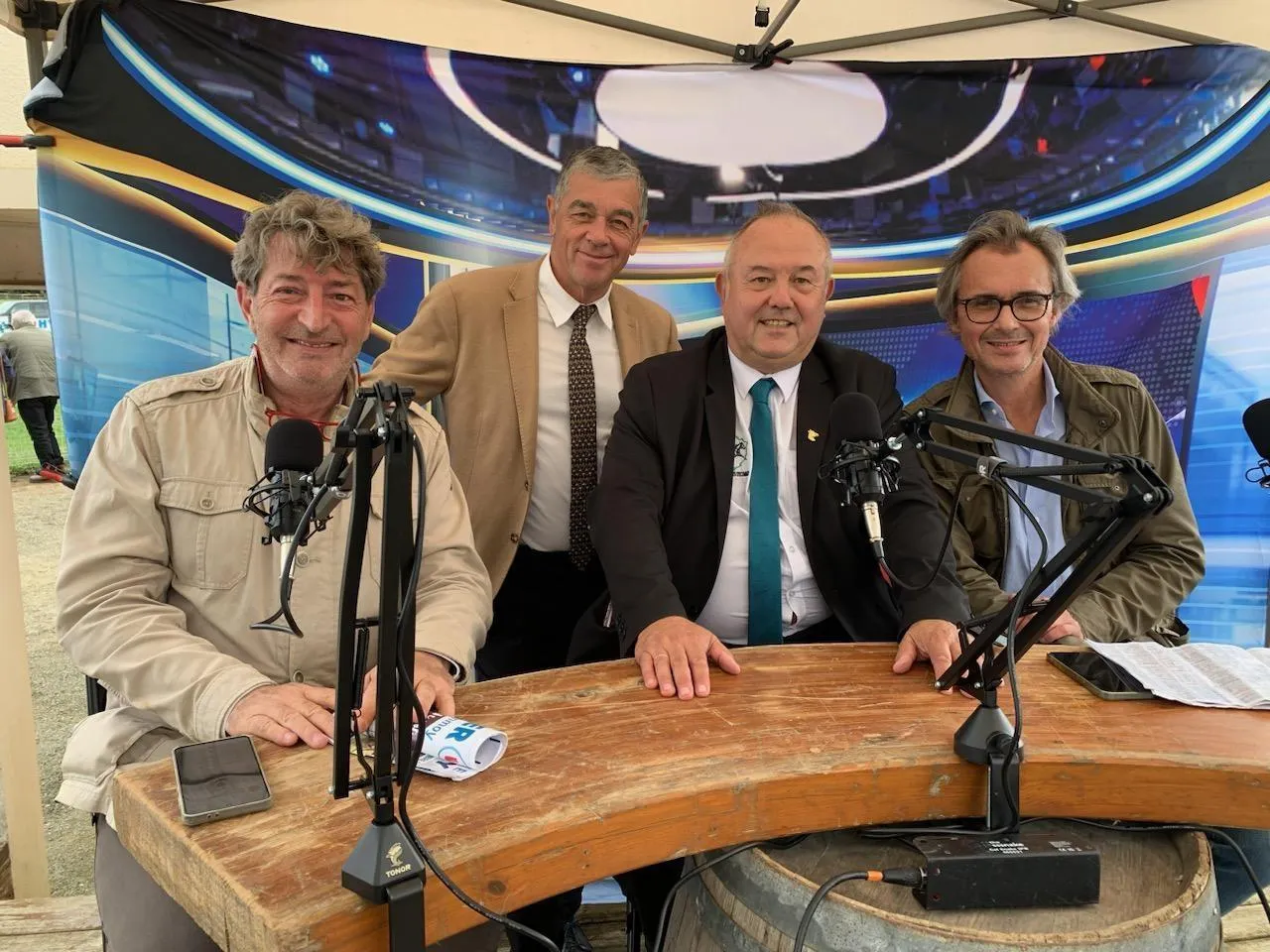 Lors de la dernière réunion hippique de la saison : Dominique Cordier (RTL), Gilles Lusson (président des courses de Durtal), Patrick Gratz (président des courses d’Écommoy) et Guillaume Coves (Equidia). © Le Maine Libre