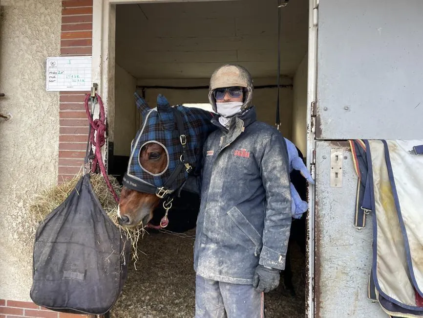 Nicolas Bazire, ici en compagnie de Jushua Tree, vendredi 16 janvier 2026 au domaine de Grosbois. © Stéphane BOIS / Ouest-France