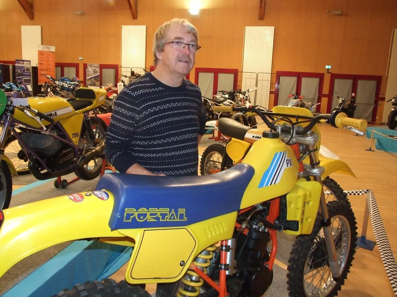 Jacky Leproust, président du Mob club montgénois, présente une moto tout-terrain de la marque française Portal, l’un des clous de l’exposition de ce week-end à Montfort-le-Gesnois (Sarthe). © Ouest-France