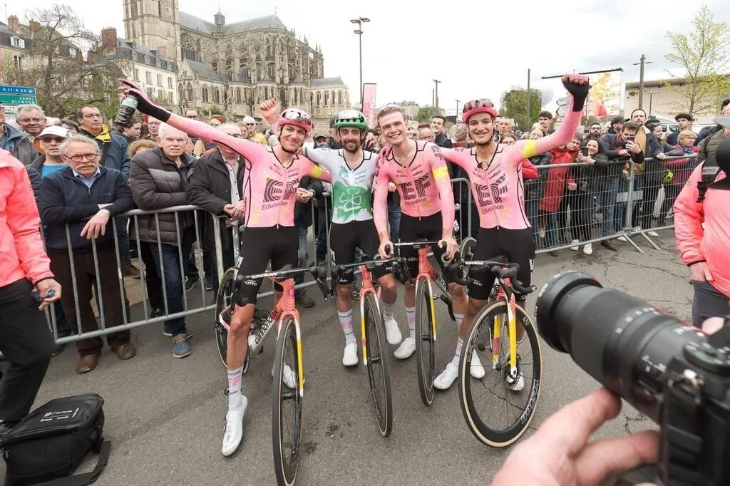 Quatre des cinq coureurs de l’équipe EF Education Easy Post : Darren Rafferty, Ben Healy, la vainqueur Marijn van den Berg et Lukas Nerurkar, au pied de la cathédrale du Mans. © Dominique Breugnot