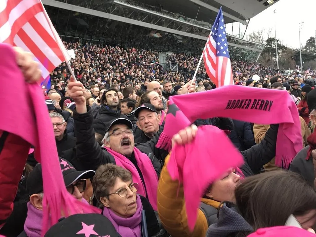 Debout dans les tribunes, écharpe rose floquée du nom d’Hooker Berry à bout de bras, Michel ...