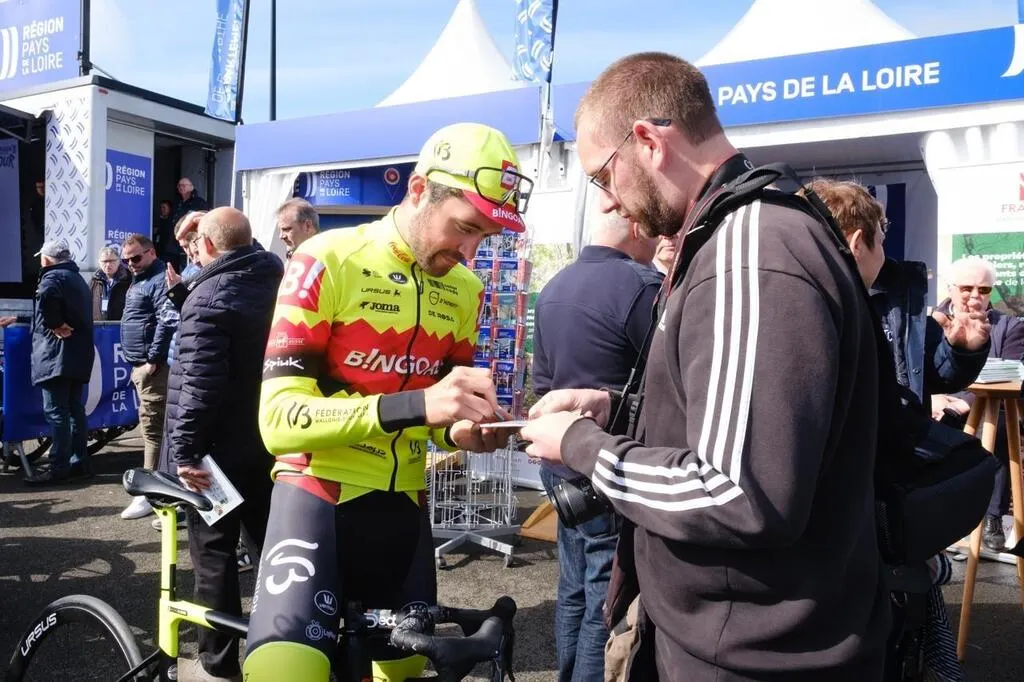 Aux abords de la ligne de départ de la 4e étape du Région Pays de la Loire Tour qui s’élançait de Sablé-sur-Sarthe vendredi 7 avril 2023, les chasseurs d’autographes étaient à l’affût des coureurs blottis dans leur bus.