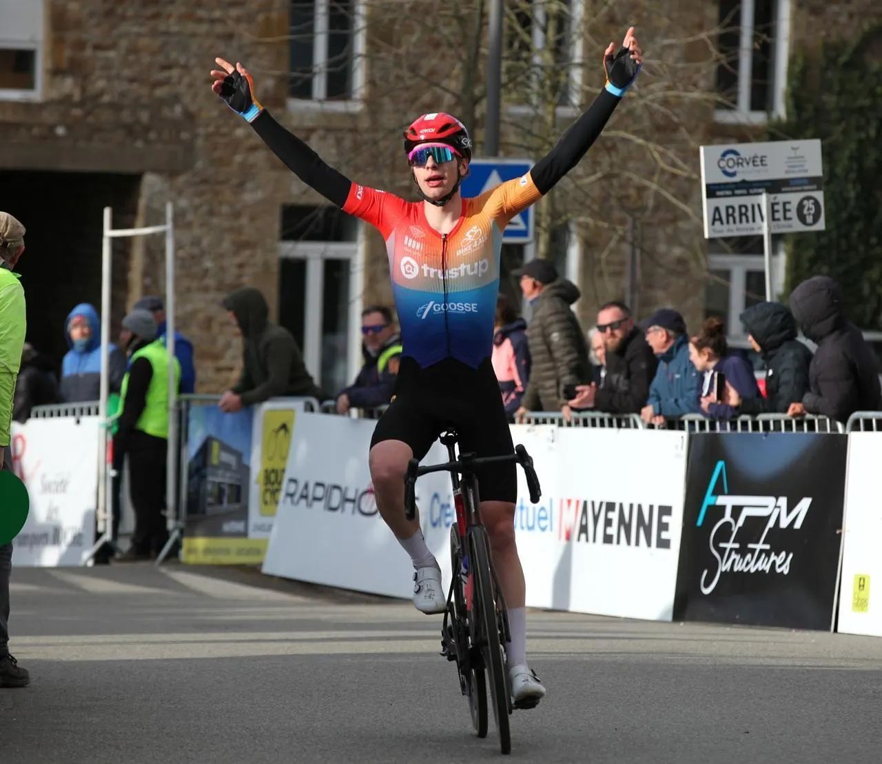 Il reste un tour à parcourir, le Polonais Maksymilian Matyasik (Soudal Quick-Step U19) lève les bras, il croit avoir gagné la première et exigeante étape à Saint-Hilaire-du-Maine… Avant de changer de braquet, désabusé car Emile Siegers (Trustup CC Chevigny) recolle à sa roue pour se disputer la victoire.