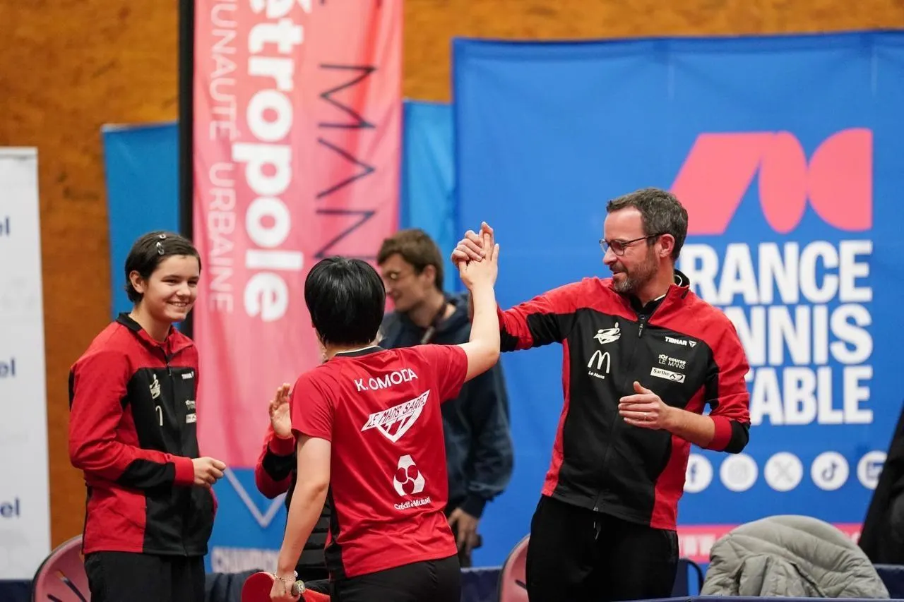 L’entraîneur manceau Jérôme Surand félicite Kotomi Omoda, sous les yeux d’Alexia Nodin, tout sourire, le 19 décembre 2026. © Arnaud Despelchain