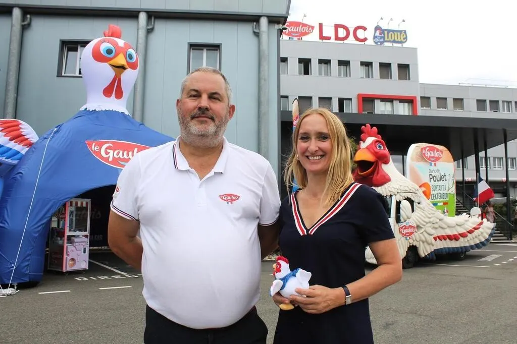 Xavier Poullain, responsable de l’événementiel et des mobilités au sein du volailler LDC, et Caroline Bruon, directrice marketing de la marque Le Gaulois, au siège du groupe, à Sablé-sur-Sarthe. © Ouest-France
