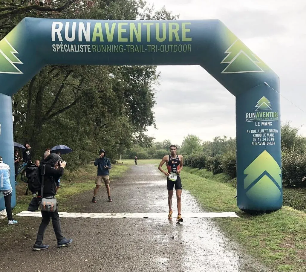 Liam Chaumulot sous l’arche d’arrivée du triathlon de Spay. © Lionel Chaumulot