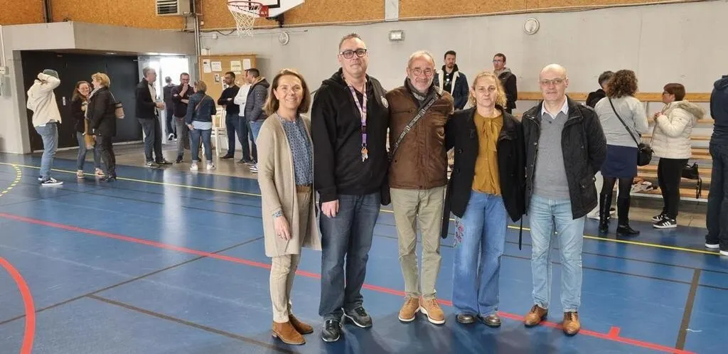 Michel Laurenson, président de Le Mans GSOS ; Francine Bouttier, présidente de Montfort Sport Basket ; Cyril Séchet, président de Neuville BA, accompagné de Véronique Cantin, maire de Neuville, et Samuel Hamelin, premier adjoint, ont préparé les « 24 heures basket ». © Ouest-France